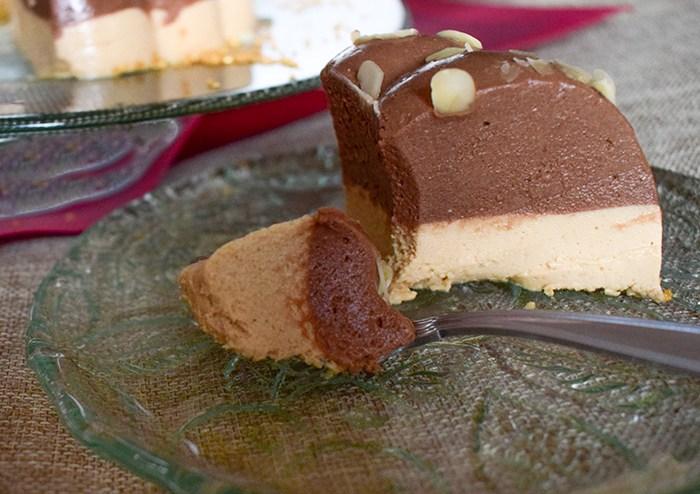 Sacamos de la nevera el molde en el que tenemos la crema de trufa y, con cuidado, vertemos la crema de turrón sobre ella. Metemos de nuevo al frigorífico hasta que cuaje, al menos 4 horas.