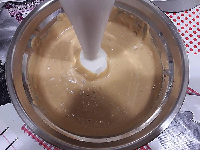 Cuando hayan pasado al menos un par de horas y la crema de praliné de trufa esté cuajada, preparamos la crema de turrón: