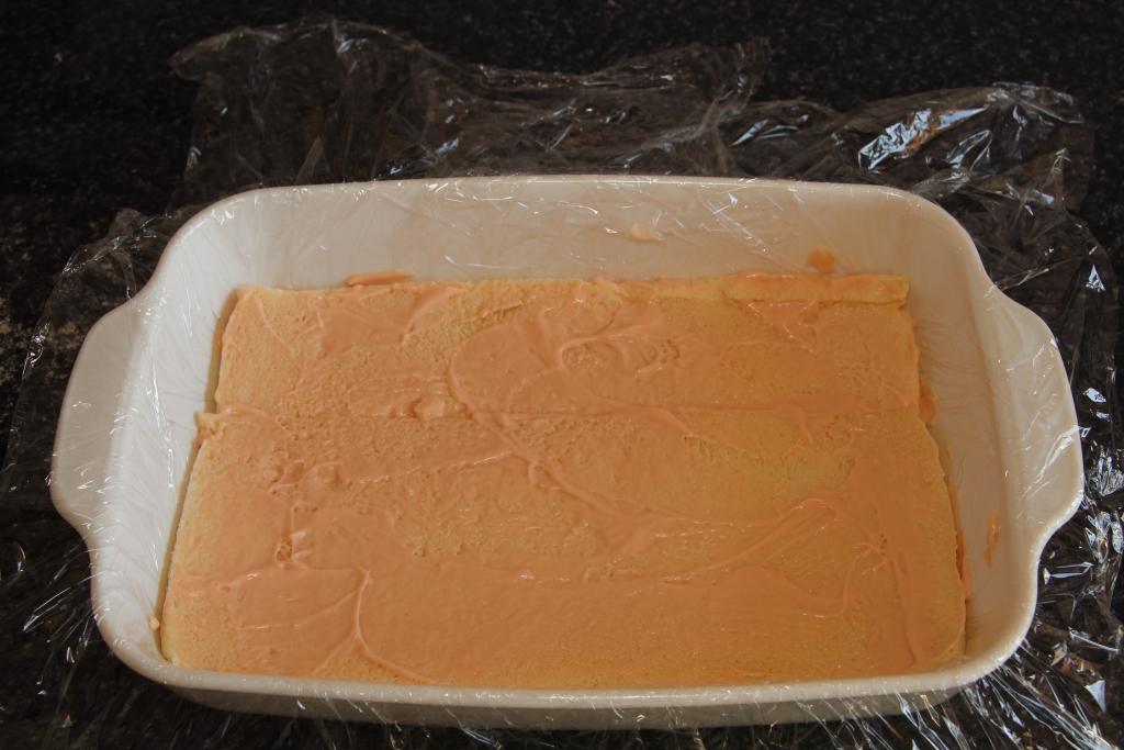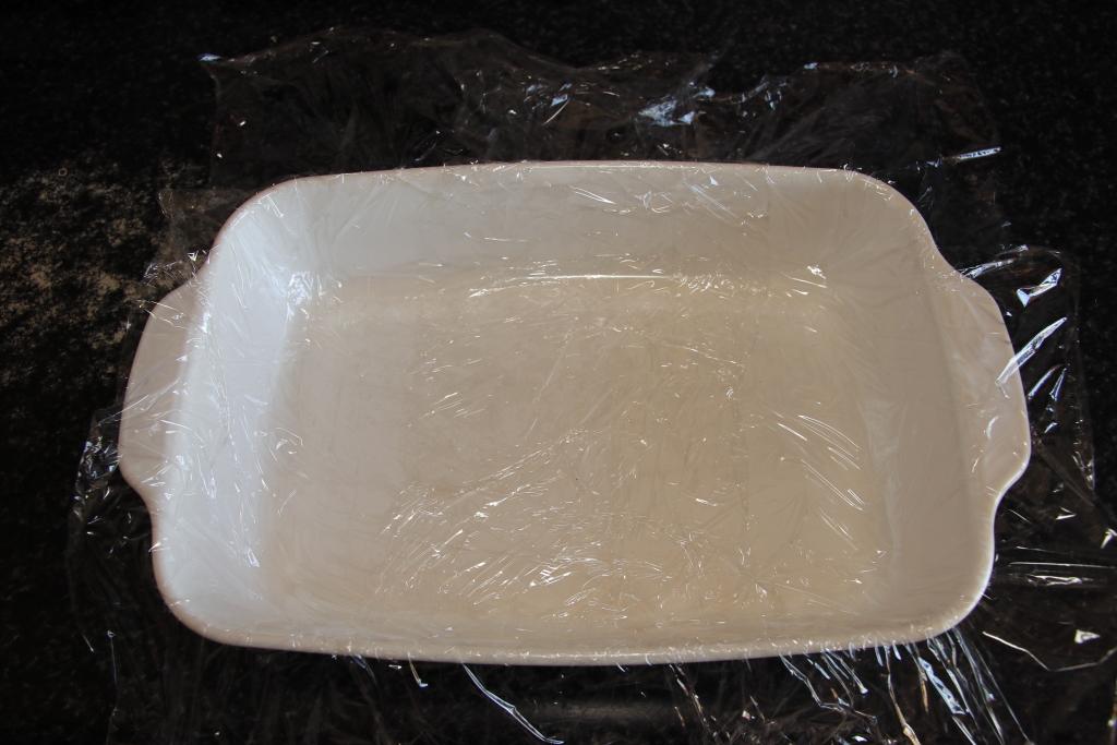 Escogemos un molde rectangular, el elegudo es de 25 x 17 x 6 cms. Forramos con film transparente, que quede bastante sobrante por fuera del molde y reservamos.