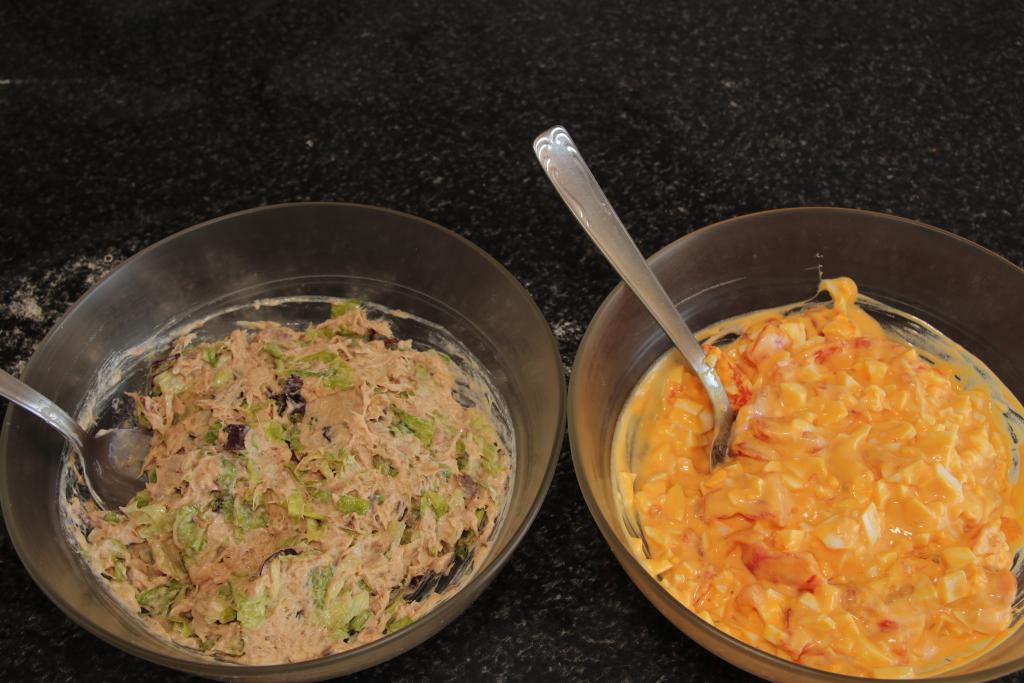 Pelamos el tomate, picamos en trocitos menudos y pasamos a un bol. Incorporamos 3 de los huevos cocidos y picados muy finamente, mezclamos bien, añadimos parte de la salsa rosa, lo justo para que quede una mezcla homogénea. Reservamos. En otro bol echamos las lechugas picaditas y el atún bien escurrido, mezclamos bien, añadimos parte de la salsa hasta que quede todo bien mezclado y reservamos.