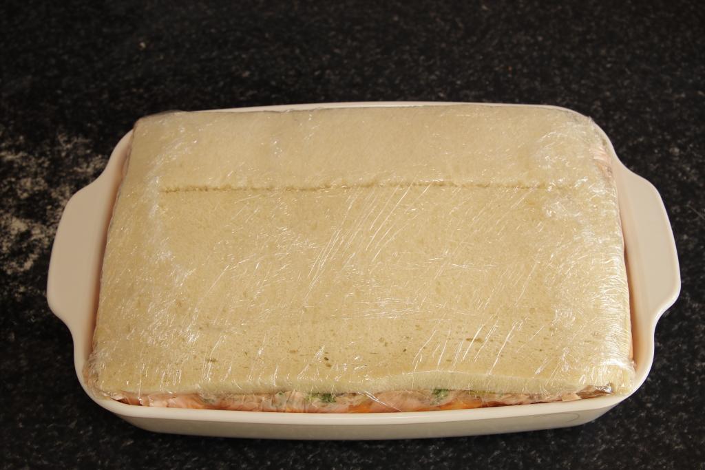 Envolvemos con el film sobrante, procurando que quede bien prieto, ponemos peso encima, botellas de aceite o bricks de leche, para que el pastel quede compacto. Y llevamos a la nevera para que se refresque (mejor si lo hacemos la víspera).