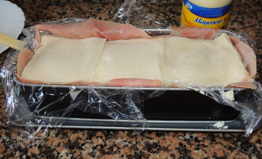 Se ponen los huevos duros a cocer durante 12 minutos, mientras tanto, se forra un molde con film transparente dejando que parte del film sobresalga del molde.