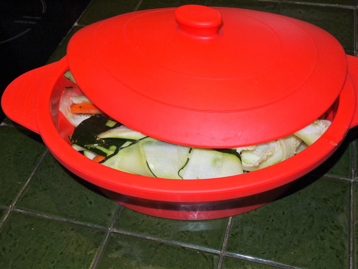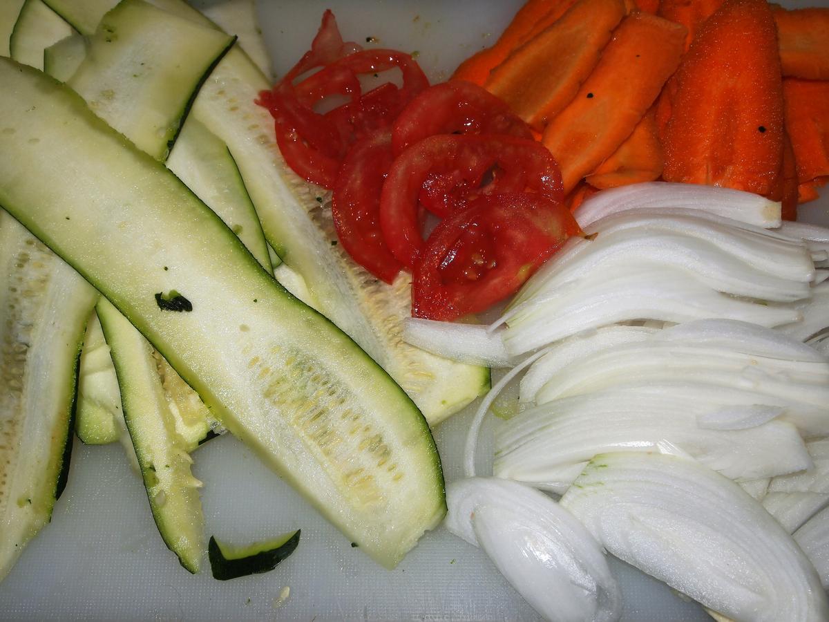 Meter todas las verduras ya cortadas 7 minutos a máxima potencia en el microondas en un reciente apto para ello. O bien escaldarlas un par de minutos en agua hirviendo.