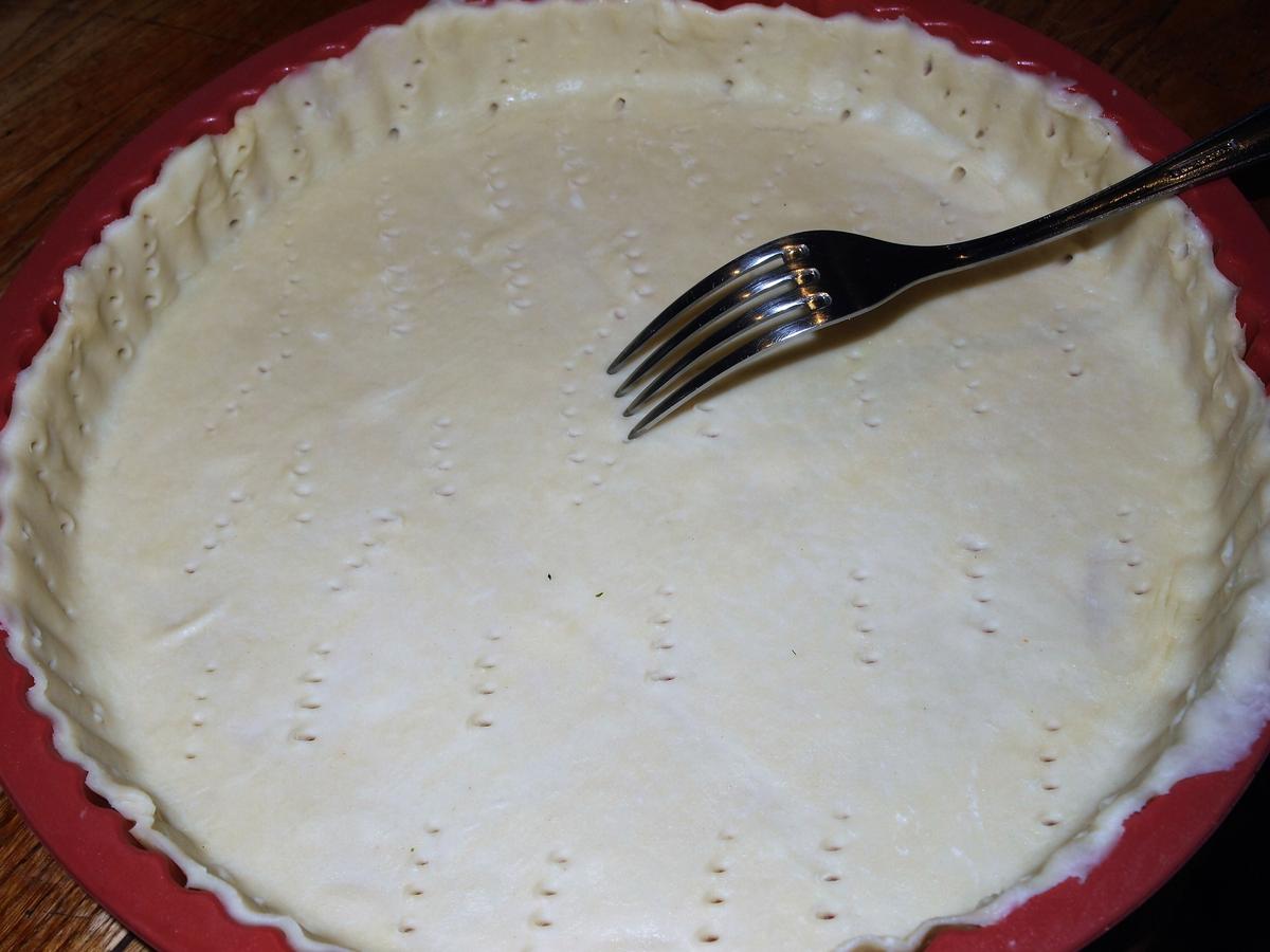 Extendemos la masas de hojaldre sobre un molde desmoldable, o de silicona engrasado previamente. Pinchamos la superficie con un tenedor.
