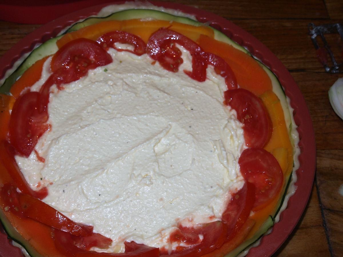 Extendemos la crema y comenzamos a colocar las verduras alrededor en forma de corona de colores.