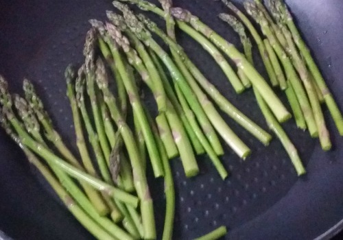 Lavar los espárragos. Ponerlos a asar en una sartén, sazonando un poco.