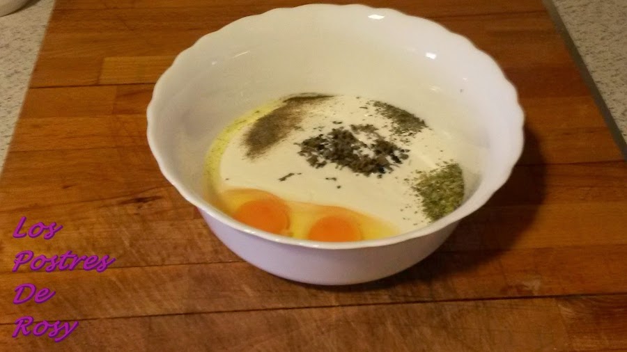 1. Ponemos en un recipiente la crema vegetal con los huevos y las especias, batimos bien y reservamos a temperatura ambiente.