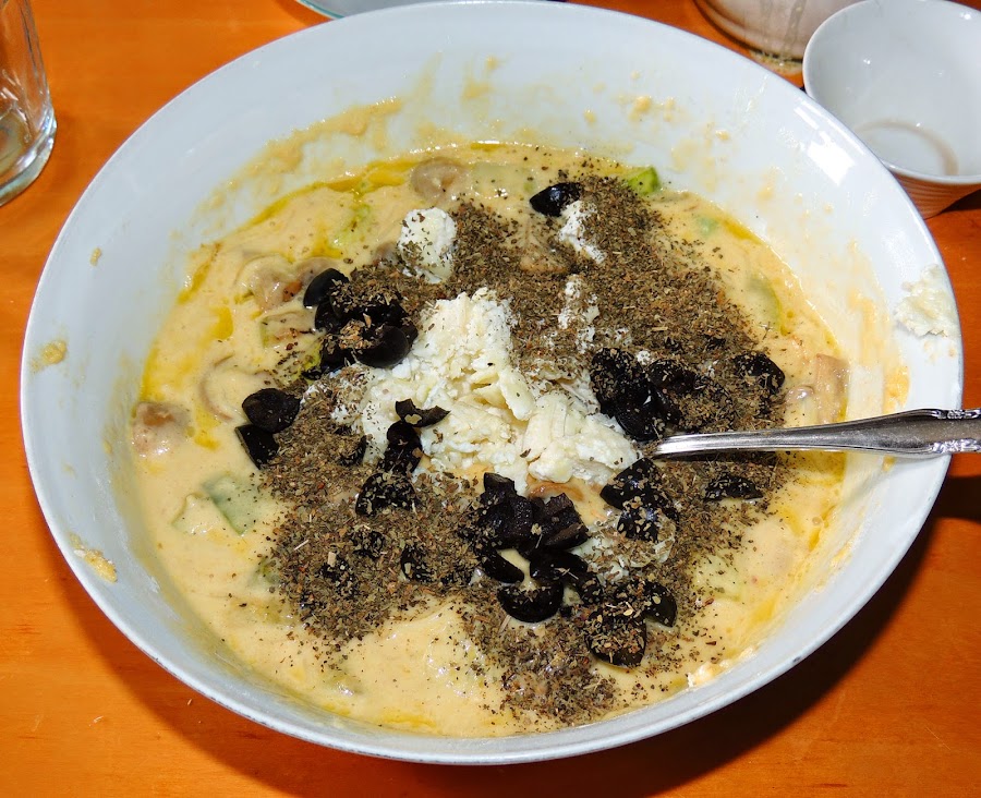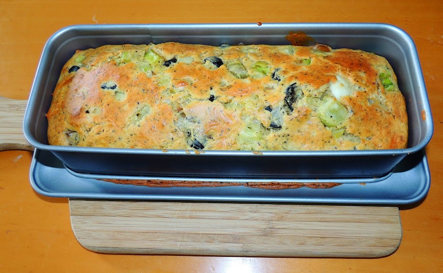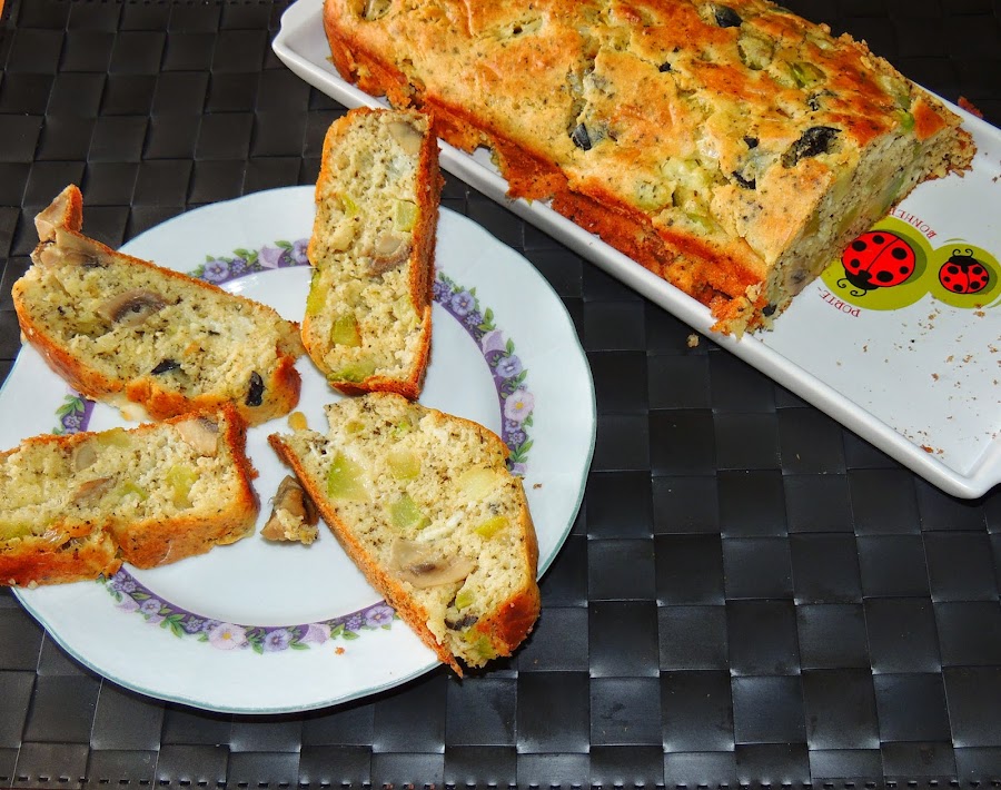 3 huevos, 50 gr. de queso rallado, 150 gr. de harina, una bolsa de levadura en polvo, 120 ml. de leche, 50 ml. de aceite de oliva, dos cucharadas soperas de aceite de oliva, un "Crotin", un calabacín, 150 gr. de champiñones, media cucharada grande de albahaca picada, 10 aceitunas negras deshuesadas, sal y pimienta.