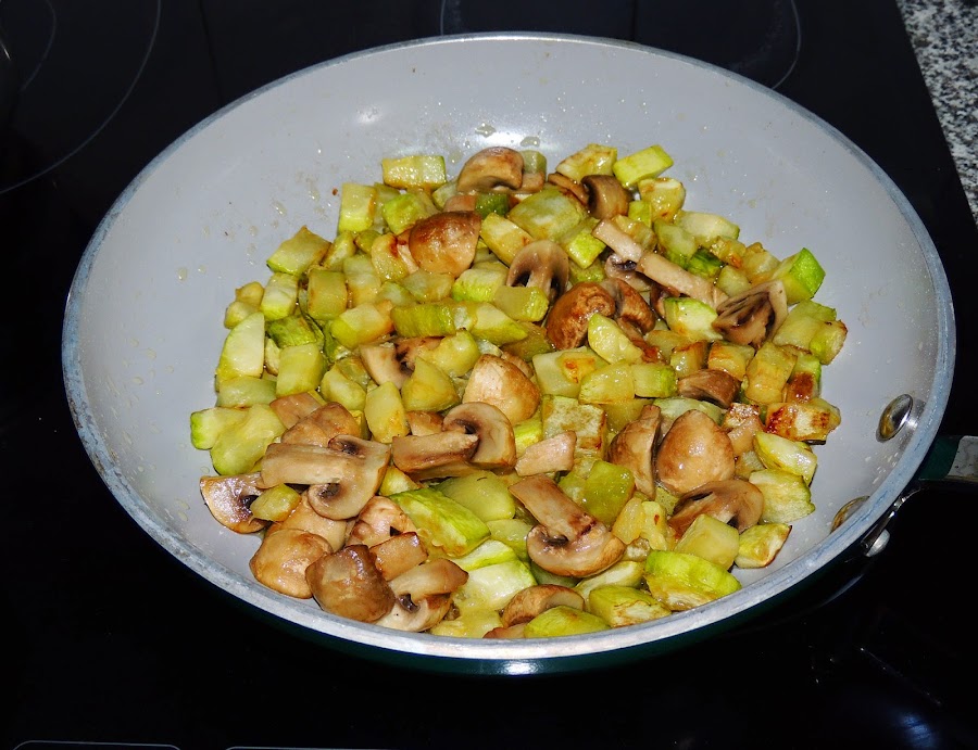 Se precalienta el horno a 200º. Se cortan el queso "crotin", el calabacín, los champiñones y las aceitunas en dados. Por otro lado, se calientan las dos cucharadas de aceite de oliva y se añaden los calabacines. Se dejan unos 8 minutos y luego se agregan los champiñones.
