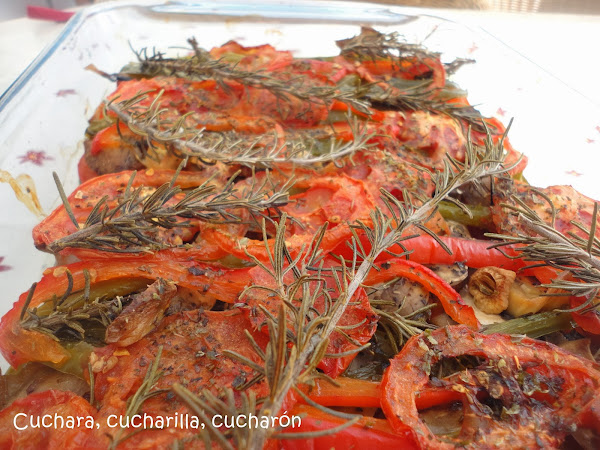 3.- Hornear a 200 º unos 40 min. El tiempo dependerá de las verduras que hayamos utilizado, puesto que no todas tardan igual en hacerse, algunas como el calabacín sueltan más agua, otras como los espárragos son más secas. Iremos pinchando con un tenedor hasta que veamos que ya están hechas.