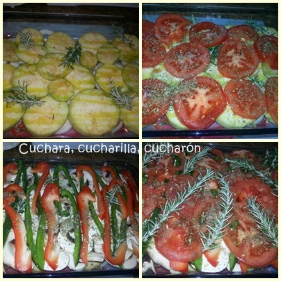 A mi me gusta empezar con cebolla y tomate, que lo hace más jugoso. Entre cada capa de verduras, condimentamos con el romero y el orégano al gusto, salpimentamos y regamos bien con aceite de oliva.
