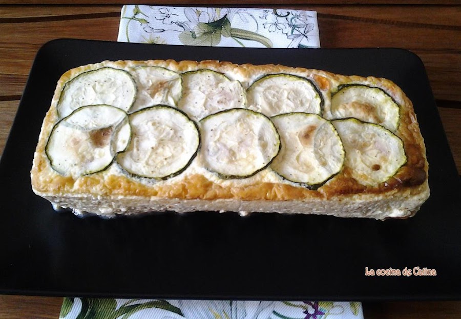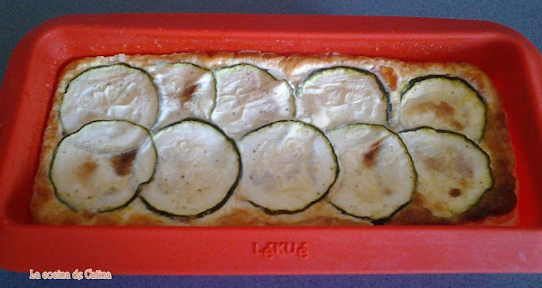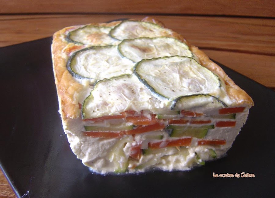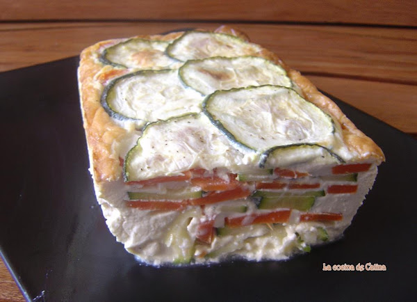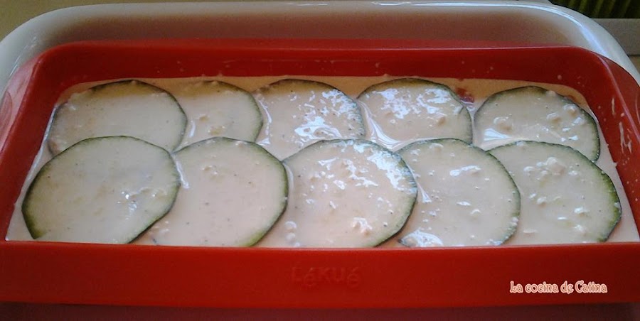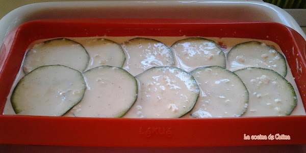 Vamos colocando en el fondo del molde rodajas de calabacín, encima las rodajas de zanahoria, encima unas cucharadas del batido que tenemos en el bol. Vamos repitiendo la operación hasta que nos quede verdura.