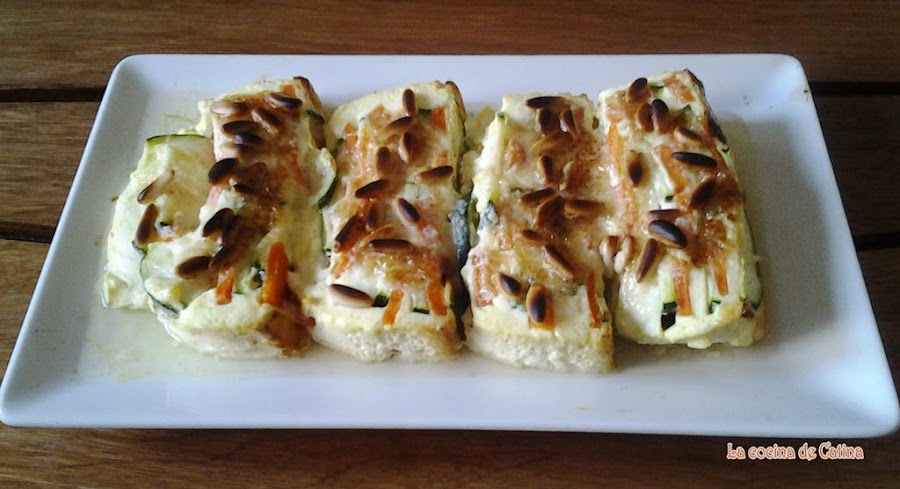 Desmoldamos, cortamos en rodajas, cubrimos por encima con la mayonesa y el alioli mezclado y echamos unos piñones. Gratinamos hasta que se dore.