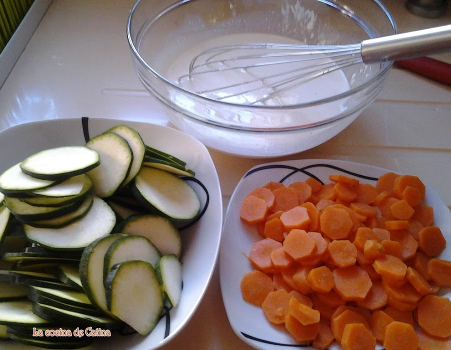 Untar un molde alargado con aceite o mantequilla. Cortar las zanahorias y el calabacín en rodajas muy finas.