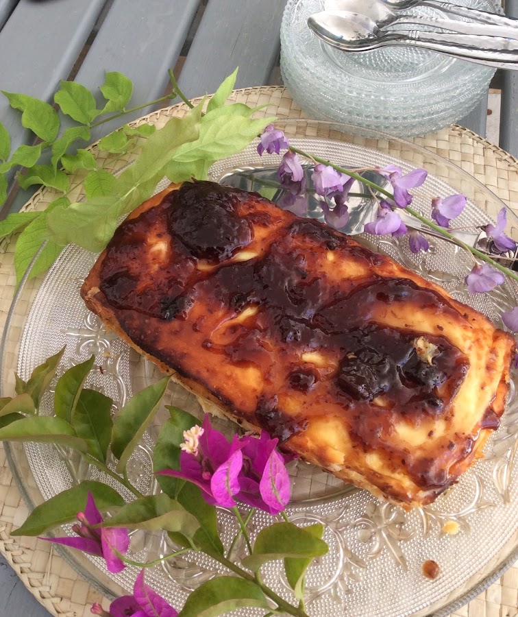 Le ponemos la mermelada por encima. Yo en esta le he puesto mermelada de frutas del bosque, por eso se ve más oscura...