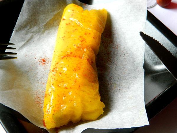 Un vez la tengas cerca del borde ( no debe ser tan al borde), comienza a enrollar el paste con la lamina, hasta enrollar el pastel de yuca por completo.