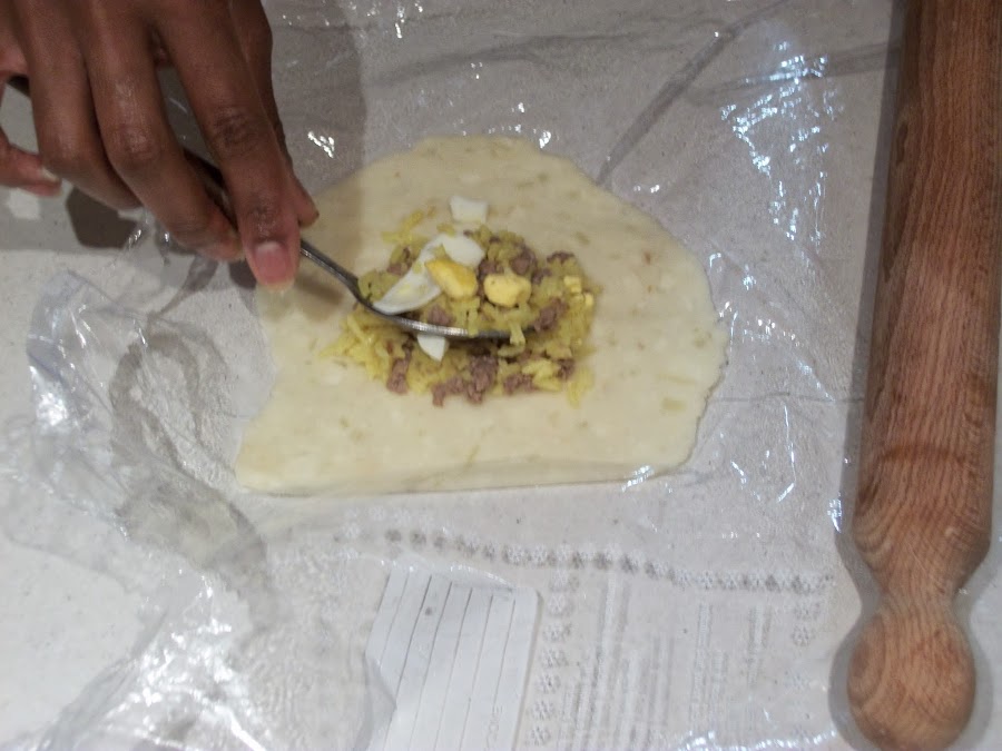 Divide la masa en bolitas y con la ayuda de un rodillo y una bolsa plástica, aplanar la masa, meter un poco del sofrito y empuñando la bolsa cierras el pastel, pasar el pastel por maizena o harina y por ultimo lo fries.