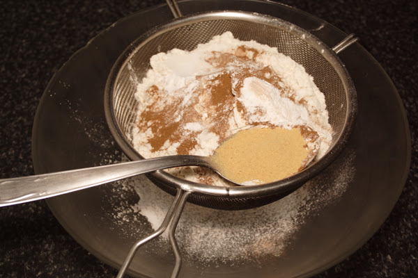 En un bol tamizamos la harina, la levadura, el bicarbonato y la sal. Añadimos la canela, el jengibre, las pasas y mezclamos bien. Reservamos.