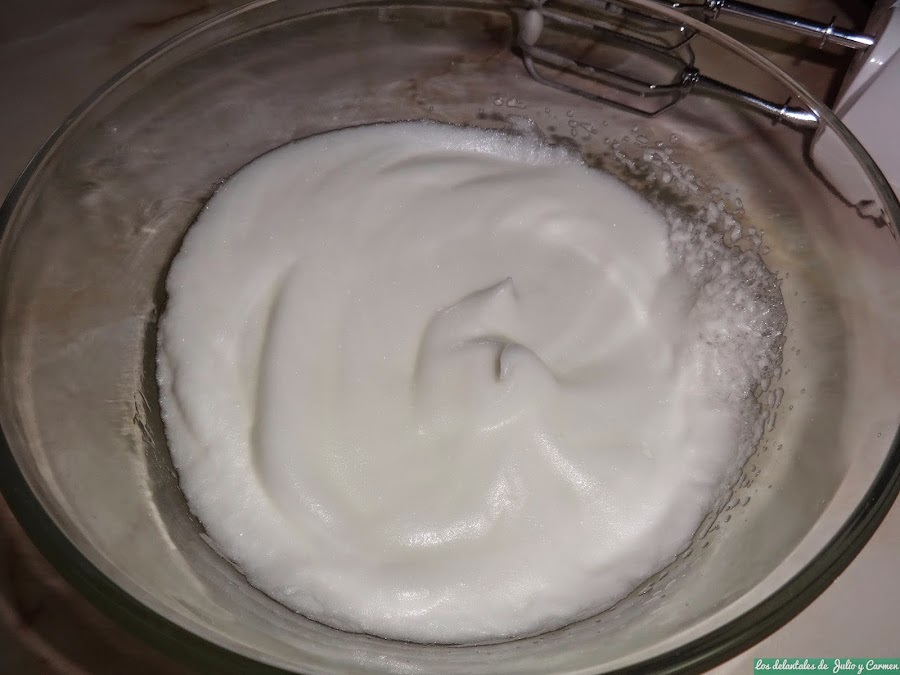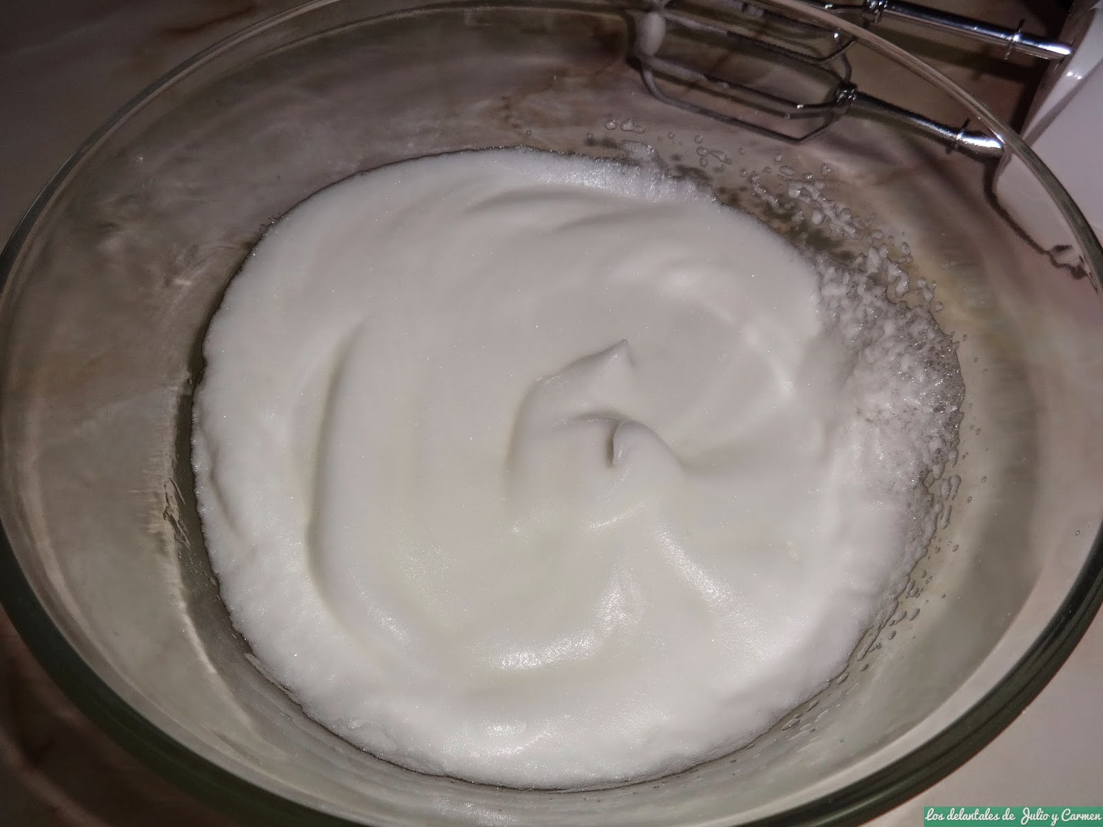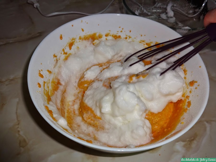 Continuamos con la preparación: montamos las claras a punto de nieve y lo unimos con la mezcla que teníamos. Con movimientos envolventes y con paciencia, iremos uniendo las dos partes, hasta que quede todo bien mezclado.