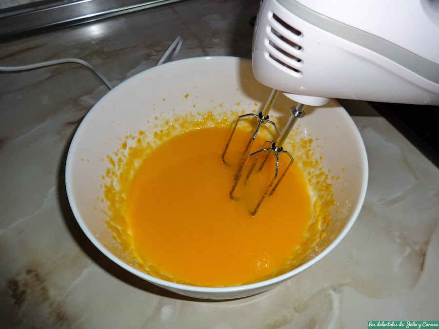Batiremos las yemas junto con el azúcar hasta que comprobemos que esta todo bien unido. Una vez lo tengamos, verteremos el aceite y continuaremos batiendo para obtener una mezcla homogénea.