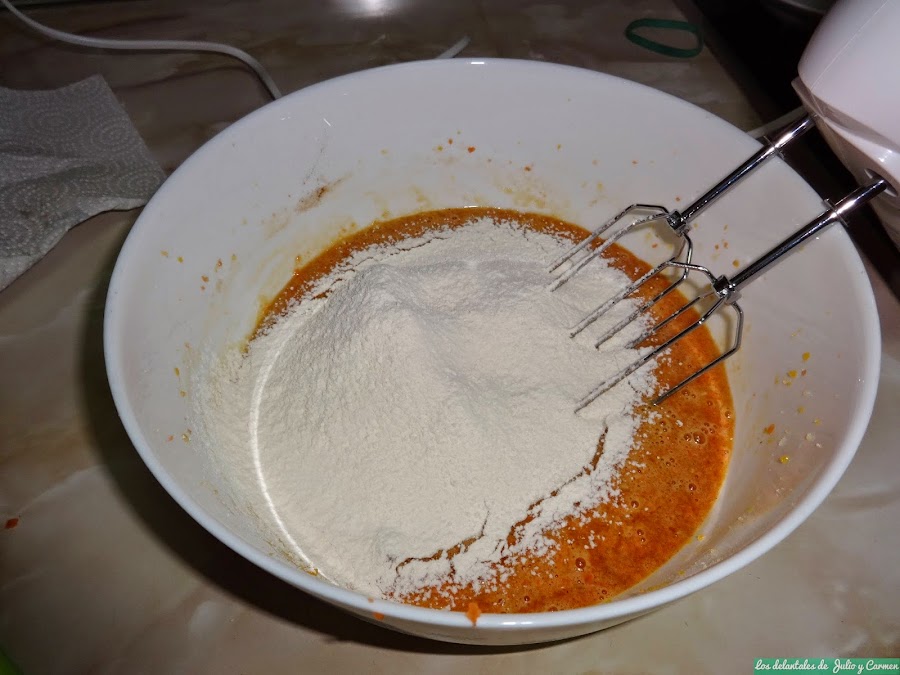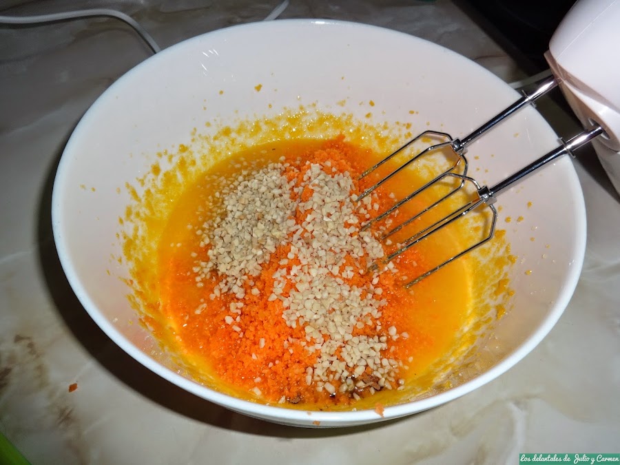 Ahora llegaba el momento de prepararlo y de buscar que receta era la que mas me convencía. Mirando y mirando, la verdad es que no encontré ninguna que me agradara totalmente. Así que cogiendo un poco de cada una (aunque estoy seguro que esta receta tal cual la hice, ya alguien la había preparado, solo que no la encontré..jeje), decidí prepararla a nuestra manera. Por supuesto no podía faltar el ingrediente estrella de este pastel, como es la zanahoria. Después, añadir un fruto seco le iba de maravilla, y a falta de nueces que no teníamos, nos decantamos por unas almendras troceadas. El resto ya lo que os podéis imaginar: harina, azúcar, levadura... Y uniendo todo, el resultado fue una tarta deliciosa, con un toque dulce de la zanahoria que, incluso a Carmen le sorprendió y agradó. No se imaginaba que la verdura en repostería podía dar tan buenos resultados.