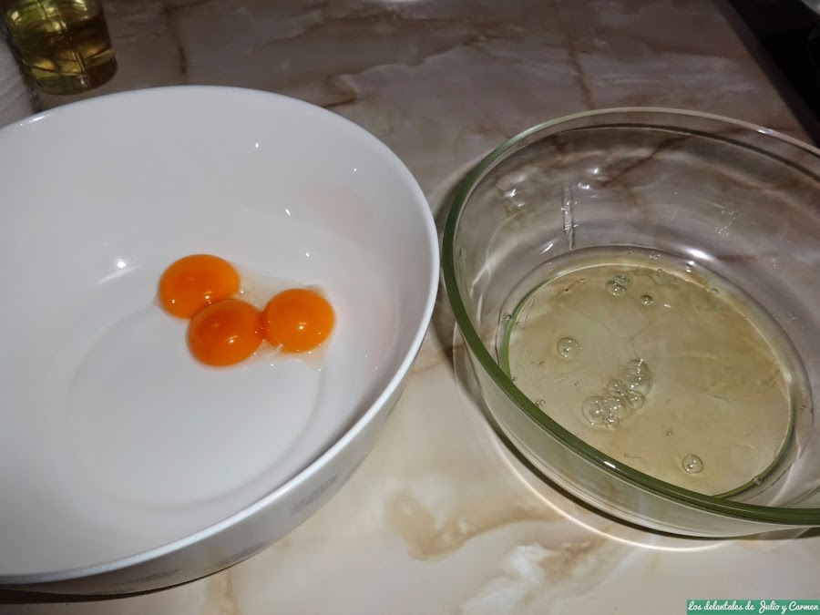 Separamos las yemas de las claras de los huevos. Reservamos las claras.