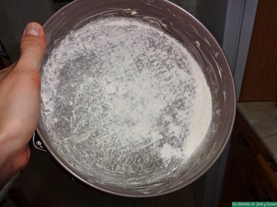 Ahora, antes de seguir, untamos el molde con mantequilla y lo enharinamos. Precalentamos el horno a 190º con calor arriba y abajo. En el momento de meterlo, dejaremos el calor solo abajo.