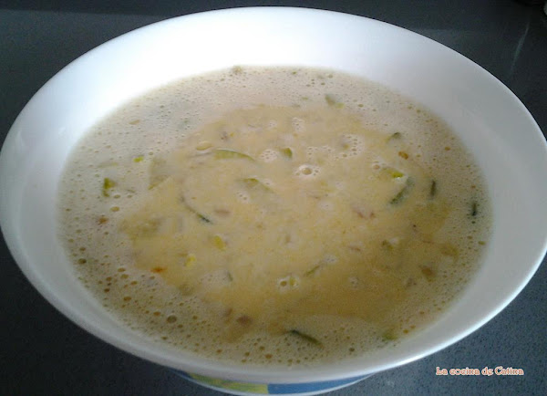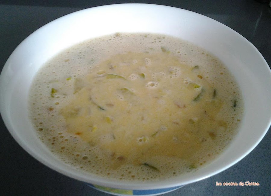 En un bol batimos los huevos, mezclamos bien con la nata (crema de leche), e incorporamos las verduras,