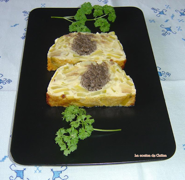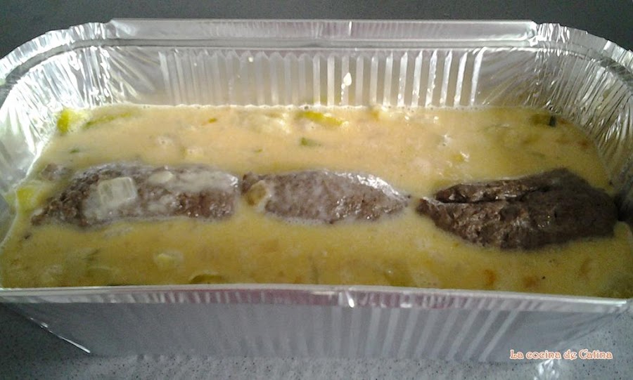 mezclamos todo bien y llenamos hasta la mitad con el zarangollo, un molde rectangular, incorporamos las morcillas sin piel