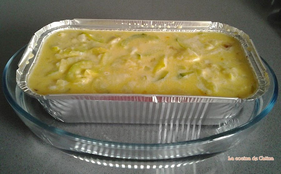 Precalentamos el horno a 180 grados y una vez caliente, metemos el zarangollo al baño maría durante unos 45 minutos. Comprobar con una brocheta que la masa está bien cuajada, si no es así, dejar un poco más en el horno.