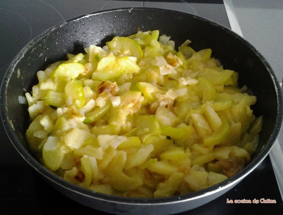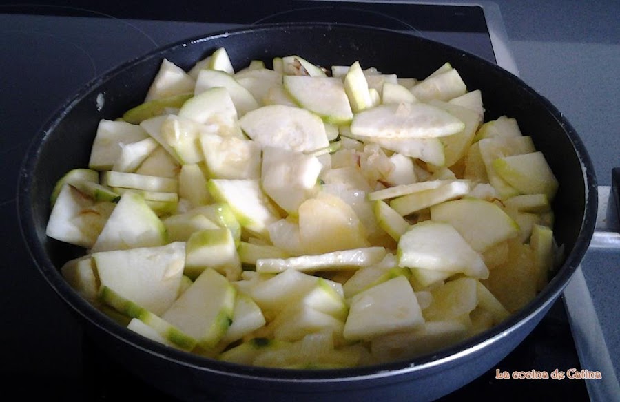 Preparación:Ponemos a calentar una sartén con aceite y freímos las verduras cortadas como si fuese para tortilla, salpimentadas.