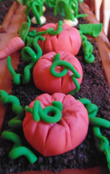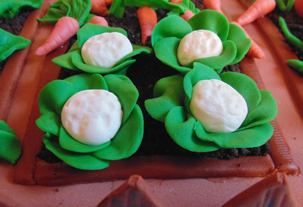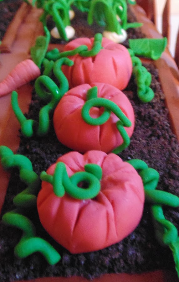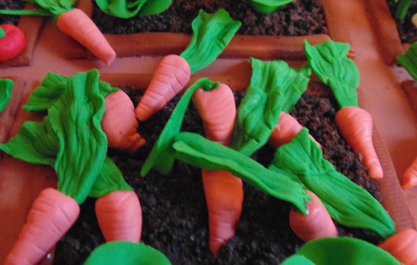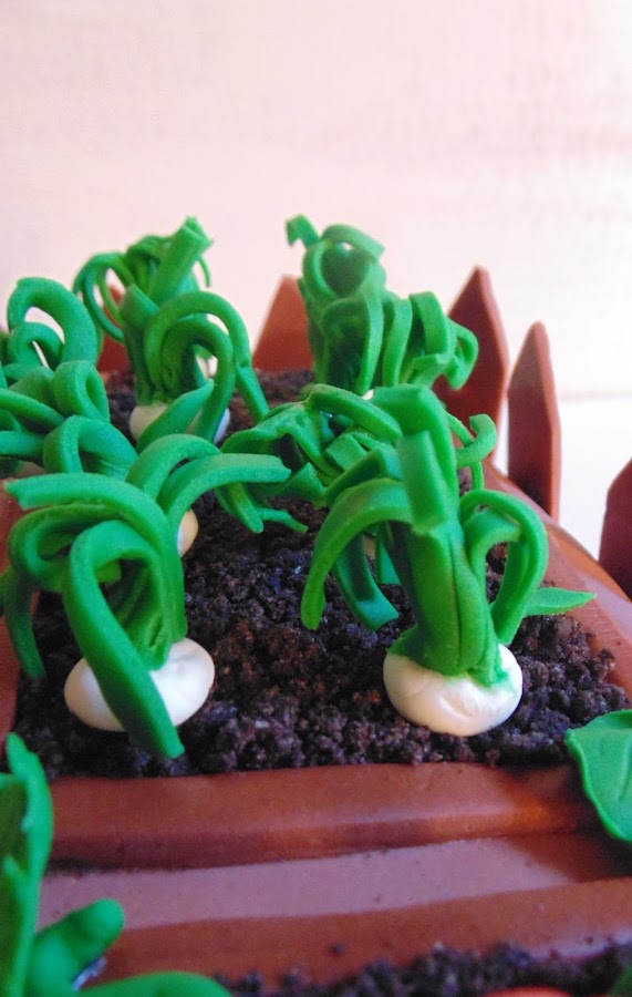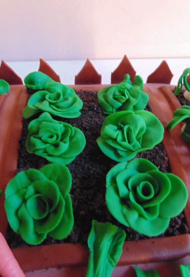 Así que me puse a hacer muchas verduritas con antelación y utilizando fondant de colores al que le agregué un poquito de cmc para que se endurezcan y no se deformen al ponerlas sobre el pastel. Tenía: