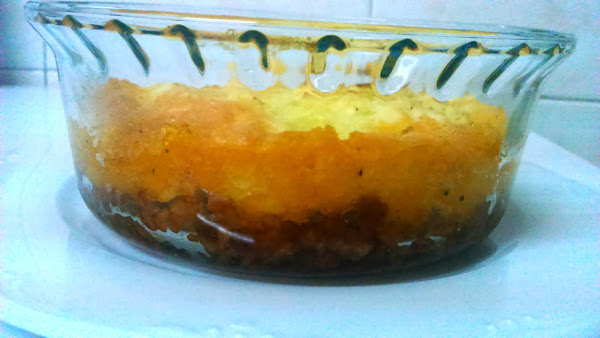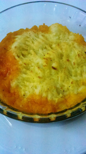 En una fuente apta para horno colocar la carne y encima el puré de patatas, puede alisarse con un tenedor o colocarlo artísticamente con una manga pastelera, pero yo lo prefiero más sencillo.