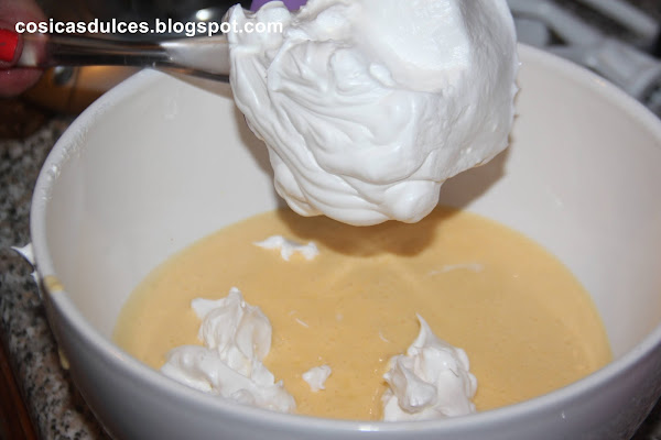 Añadimos el merengue a la mezcla que teníamos reservada y mezclamos con movimientos envolventes.