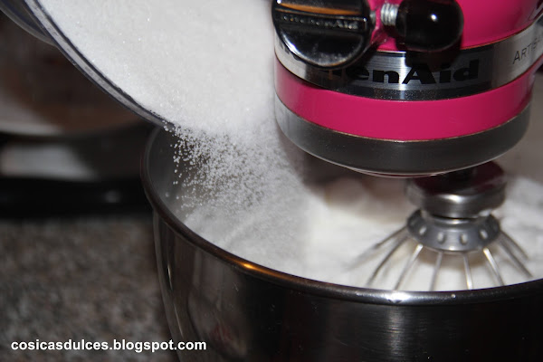 Reservamos la mezcla anterior. Batimos las claras a punto. cuando estén a punto de nieve añadimos el azúcar y seguimos batiendo hasta obtener un merengue que forme picos duros.