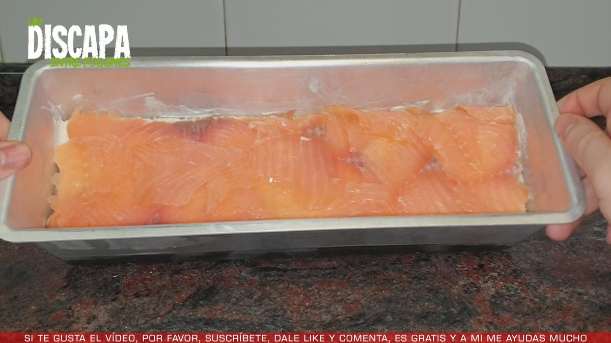 Y ahora vamos a colocar unas lonchas de salmón ahumado, procurando que quede lo mejor repartido posible.
