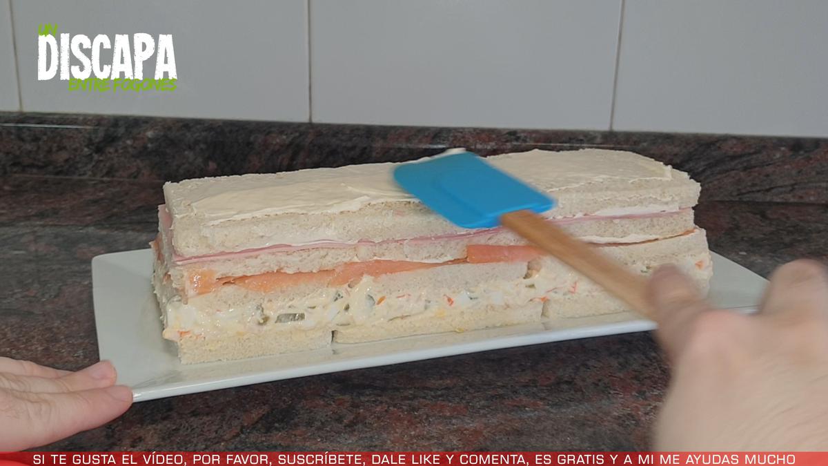 7Ahora untamos una capa de mayonesa por todo el pastel.