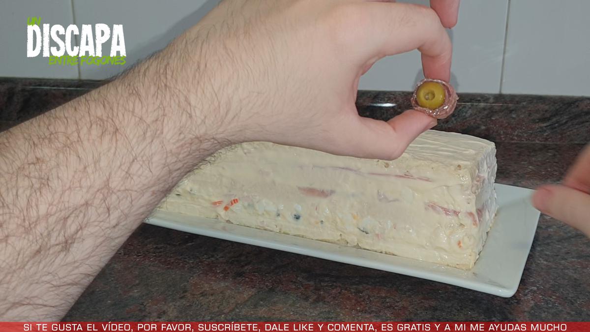 8Por último, a modo de decoración enrollamos una anchoa en salazón alrededor de una aceituna y la colocamos en la parte superior del pastel.