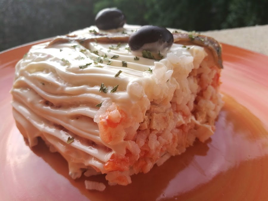 - Ponemos en la base una capa de arroz, la mitad del bonito encima, otra de arroz, una de tomate, arroz, bonito y acabamos con arroz.