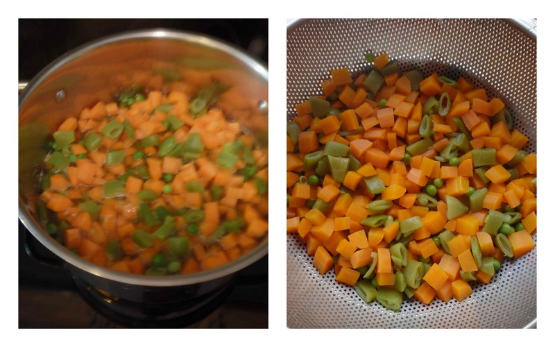 Si las judías son congeladas las ponemos a hervir primero, en cuanto lleven unos 5 minutos hirviendo y ya estén descongeladas añadimos las zanahorias y las cocemos hasta que estén al punto. Deben quedar al dente, no demasiado hechas pues se desharían al mezclarlas con el resto de ingredientes.