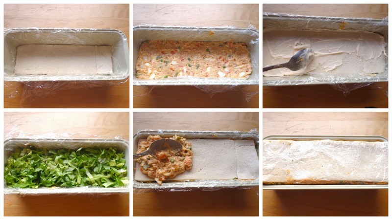 Repartimos el relleno que no queda por encima del pan y finalmente lo tapamos con otra capa de pan. Presionamos y tapamos todo el pastel con el papel film que sobresalía del molde.