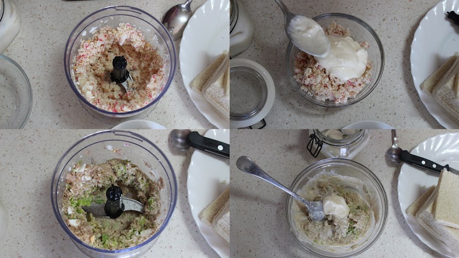 Picamos los palitos de cangrejo o surimi junto con los huevos en la picadora. Los mezclamos con 2 cucharadas de mayonesa. Lo reservamos.