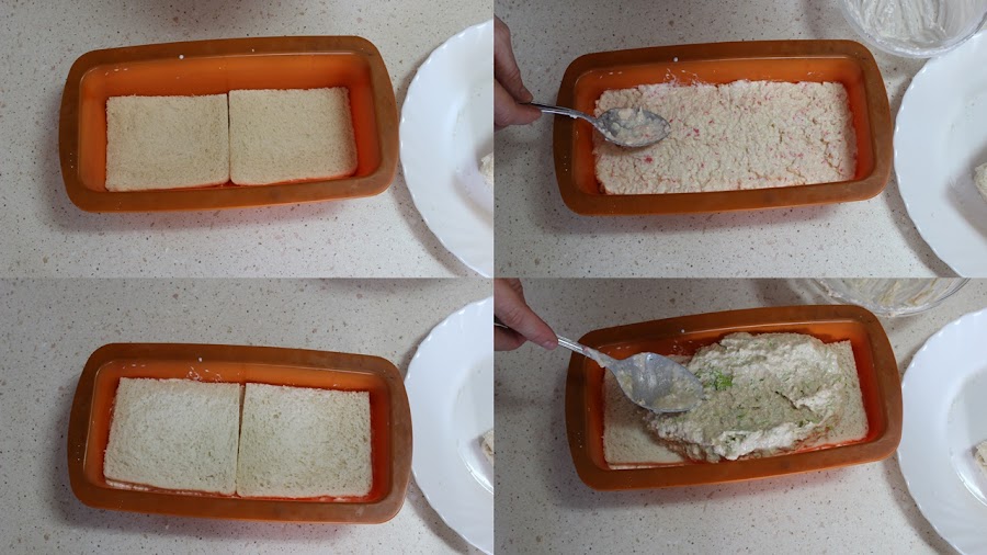 Montamos el pastel poniendo rebanadas de pan de molde en el fondo del molde, ponemos la mezcla de palitos de surimi encima.