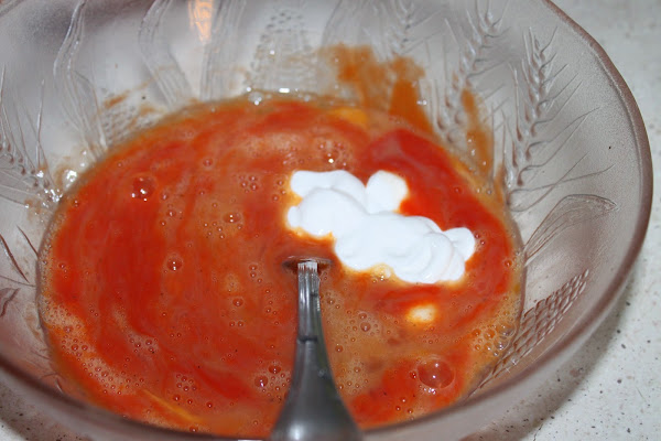 Mezclamos bien y lo echamos en un recipiente apto para microondas. yo lo he hecho en dos pequeños porque era para un aperitivo pero se puede hacer en uno de plum cake mas grande. Lo tapamos con film transparente y lo pinchamos una o dos veces con un cuchillo para que salga el vapor.