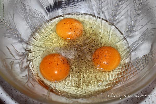 En un bol ponemos los huevos con una poquita sal y pimienta molida. los batimos un poco.