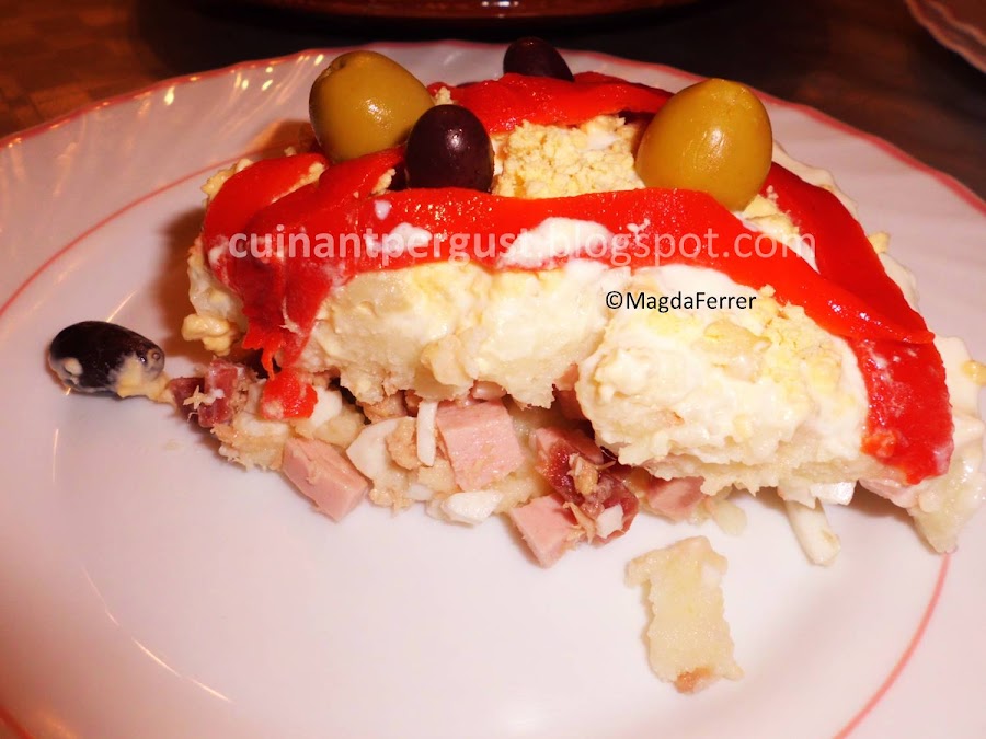 En un molde desmontable de unos 20 cm. disponer una capa de puré de patatas, encima de ésta repartir la mezcla de fiambres, atún y clara de huevo y sobre ella repartir lo que queda del puré procurando alisarla lo mejor posible. Reservar en el frigorífico un par de horas.