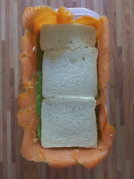 Doblamos hacia dentro el salmón que sobresale. Tapamos y metemos en la nevera mínimo 24 horas, para que el pan se empape y quede jugoso.