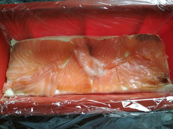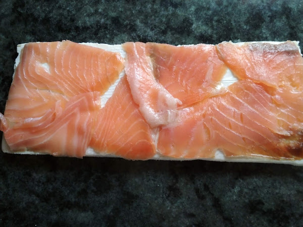 Cogemos la primera lámina de pan y la untamos con el queso crema. Ponemos las lonchas de salmón ahumado por encima y la colocamos al fondo del molde.