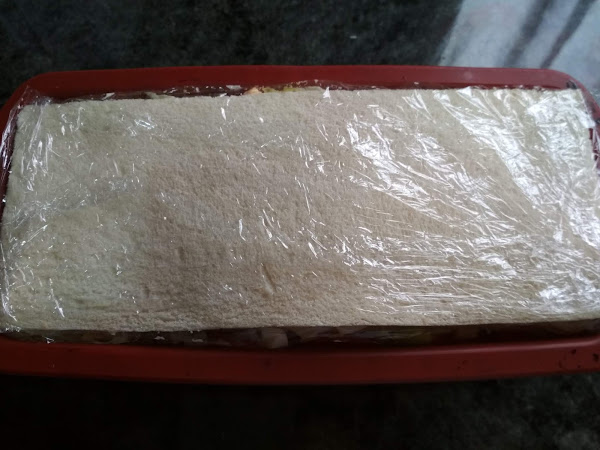 Colocamos la quinta lámina y se aprieta un poco para que cohesione, se tapa con el film que sobresale para que no se reseque y se mete a la nevera un par de horas mínimo.