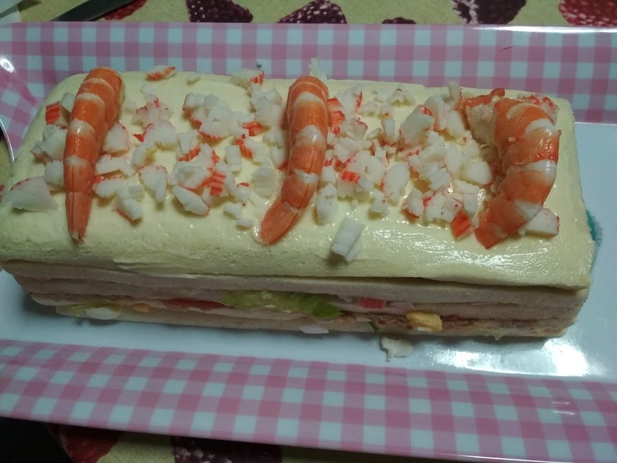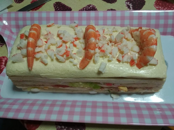 Cuando queramos comerlo, se abre el film, lo volcamos sobre una bandeja y retiramos el papel film del todo. Se unta con mahonesa y se decora con langostimos, pimiento morrón, aceitunas o como más os guste.